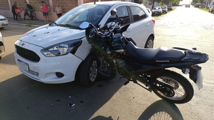 acidente envolvendo um Ford Ka branco e uma moto preta ocorreu na Avenida