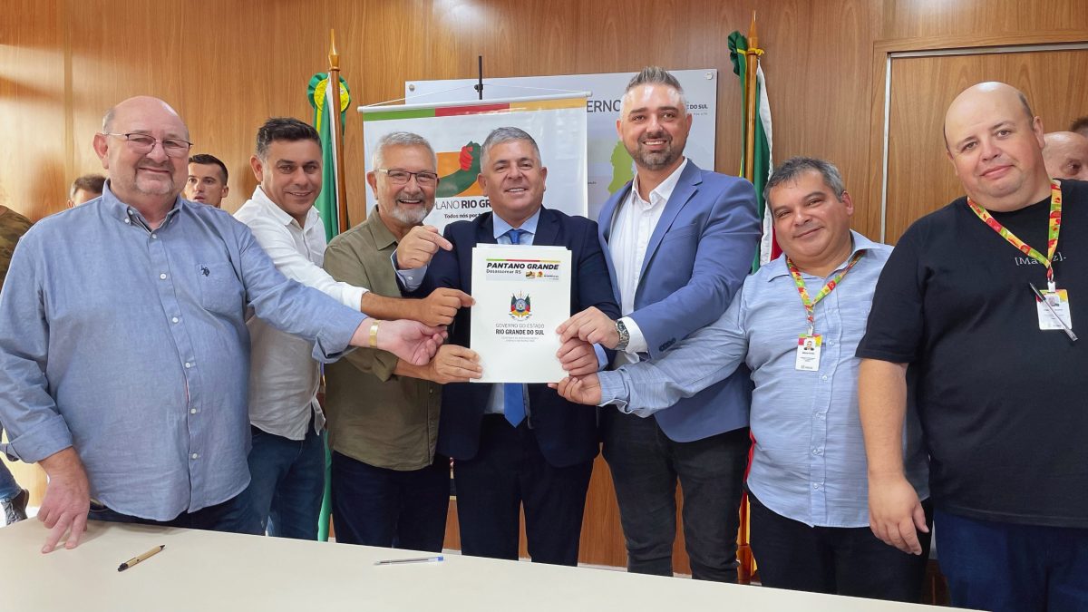 Na manhã desta terça-feira, 1º de abril, foi realizada a solenidade oficial de assinatura do termo de adesão ao Programa Desassorear RS, promovido pelo Governo do Estado. O prefeito Mano Paganotto, acompanhado do vice-prefeito Juninho Pires, esteve em Porto Alegre para formalizar a participação do município de Pantano Grande. Durante a visita, o políticos também se reuniram com o Governador do Estado, Eduardo Leite, reforçando a importância da parceria entre o município e o Governo Estadual para a execução do projeto.